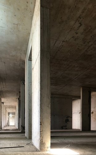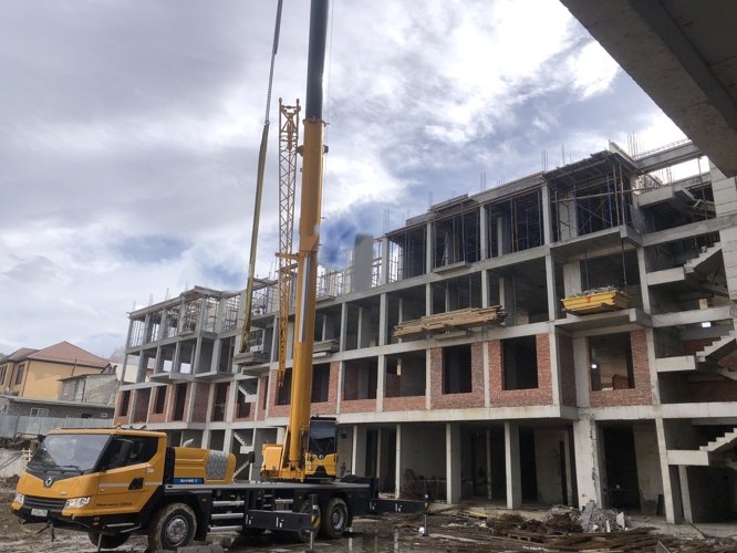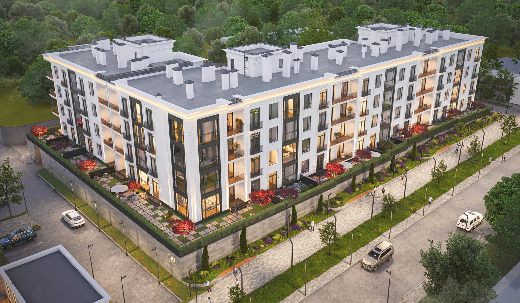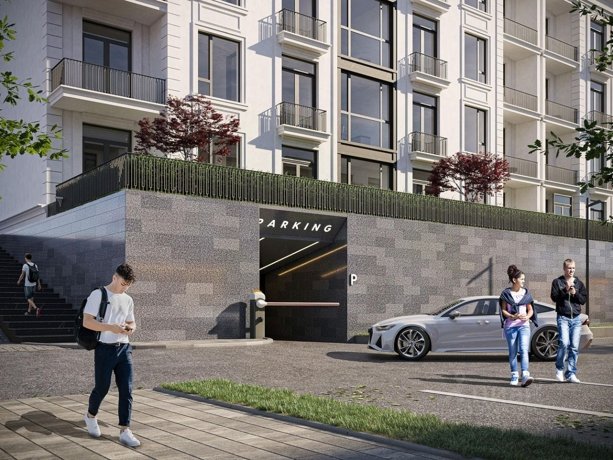 Элегантное четырёхэтажное здание из белого кирпича в стиле неоклассицизм: широкие окна, изящные балкончики, элементы декора и контрастные вставки чёрного мрамора подчёркивают утончённый характер комплекса.