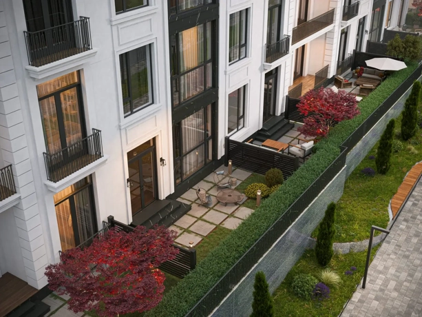 Во внутреннем камерном дворе царит атмосфера приватного курорта: среди живой зелени расположены уютные беседки с мягкими пледами, вечером разгорается открытый камин, а белый экран уличного кинотеатра дарит жителям тёплые кинопоказы под звёздным небом